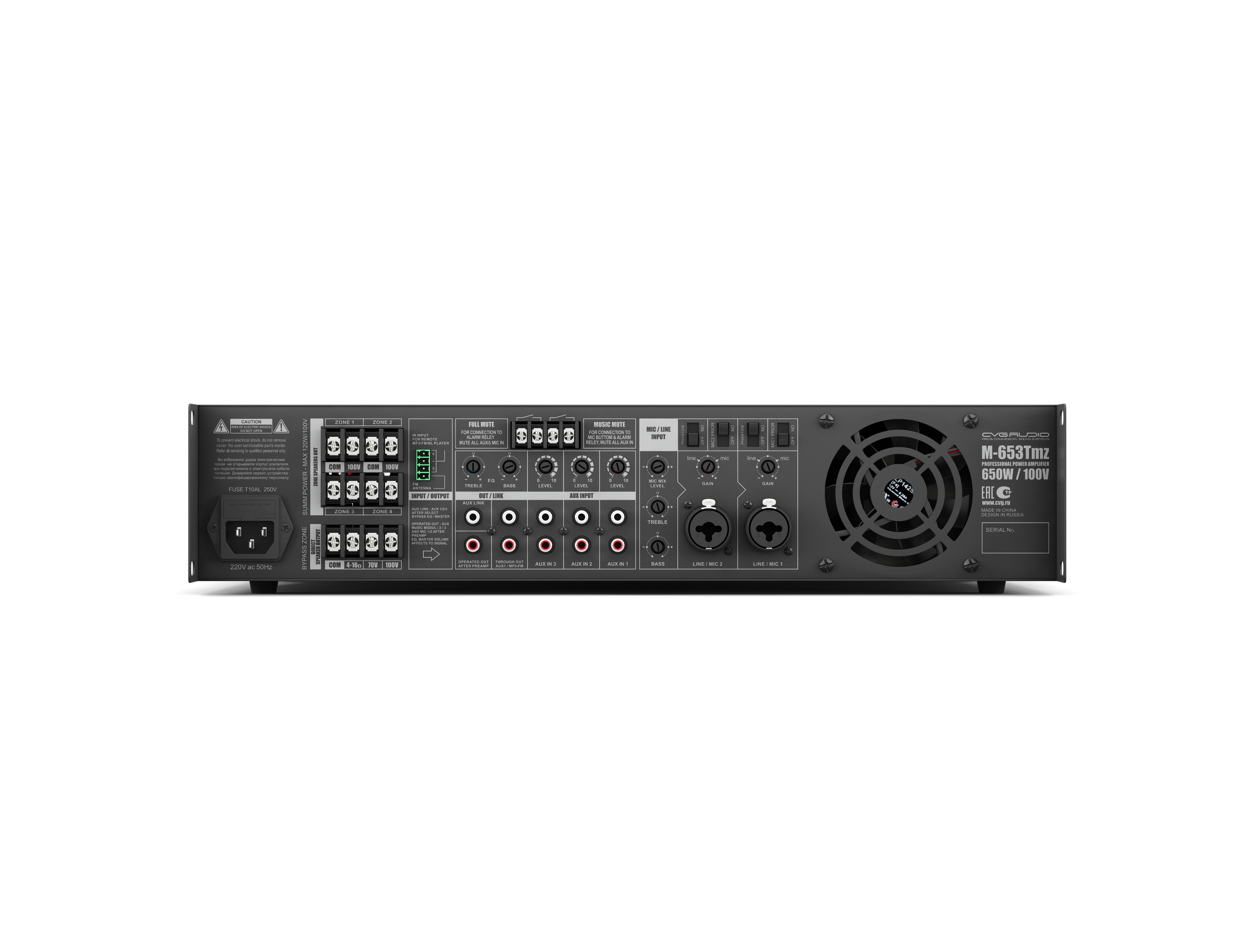 M-653Tmz - усилитель профессионального класса мощностью 650 Вт, предназначенный для использования в составе систем фонового озвучивания и речевого оповещения магазинов и супермаркетов, кафе и ресторанов, гостиниц и отелей, фитнес клубов и салонов красоты, офисных помещений и любых других мест, где необходимо обеспечить качественный звук в сочетании с широкими функциональными возможностями усилителя. Прибор одинаково эффективно работает как с трансформаторными (70/100 В), так и с низкоомными (4-16 Ом) акустическими системами, что значительно расширяет сферу использования и делает его практически универсальным.