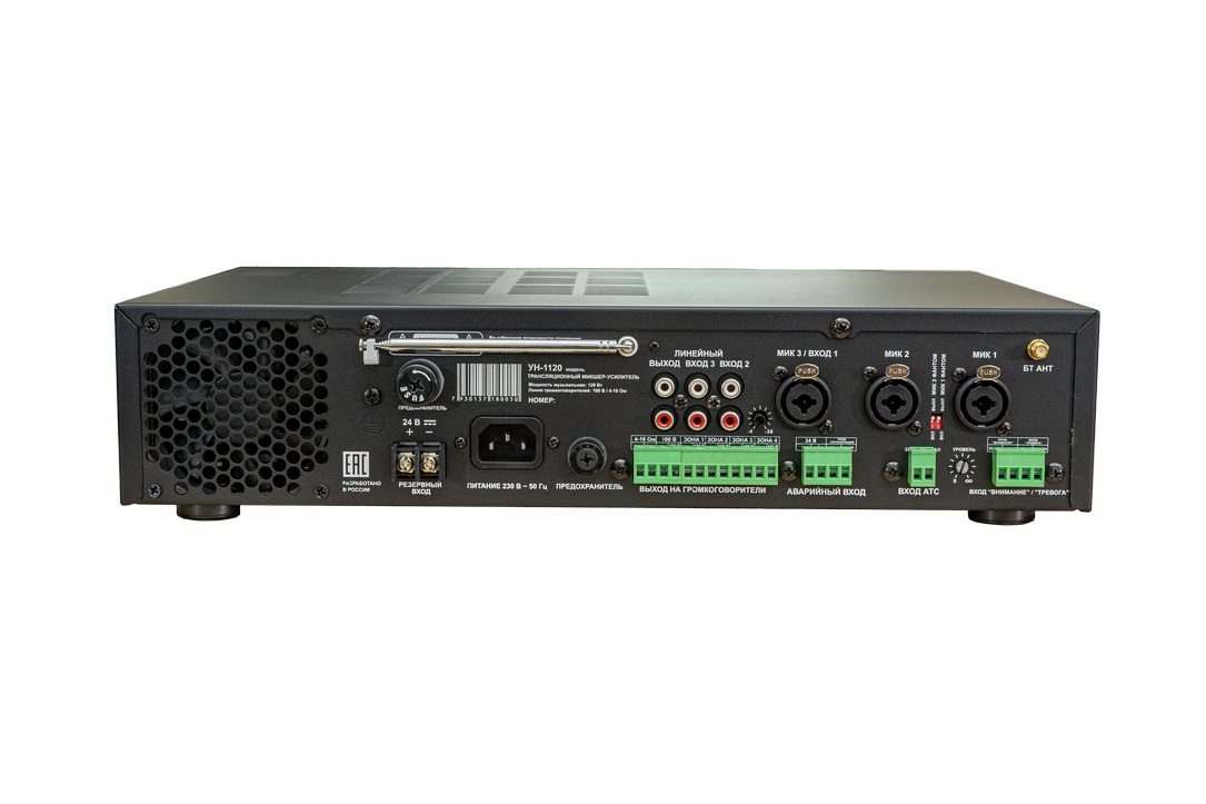 Одноканальный, выходная мощность = 120 Вт. Усилитель можно использовать с низкоомными (импеданс 4-16 Ом) или с трансляционными (напряжение 100В) громкоговорителями. Зональное вещание доступно только трансляционным! Рабочий диапазон частот 20 Гц - 20 кГц, соотношение сигнал/шум >90 дБ.