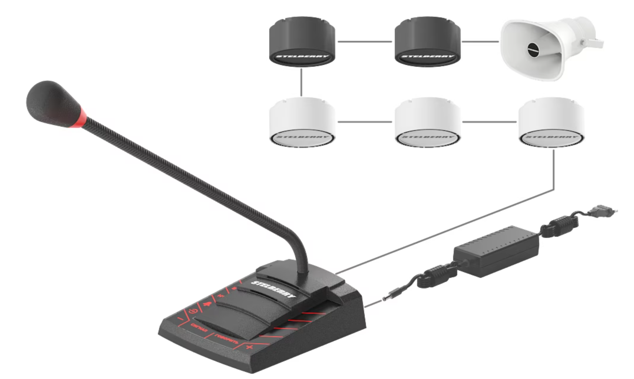 Выходная мощность системы достигает 60 Вт, что означает необходимость соблюдать ограничение общей мощности подключенной акустики до указанного значения. В качестве акустических систем должны использоваться громкоговорители STELBERRY серии F.