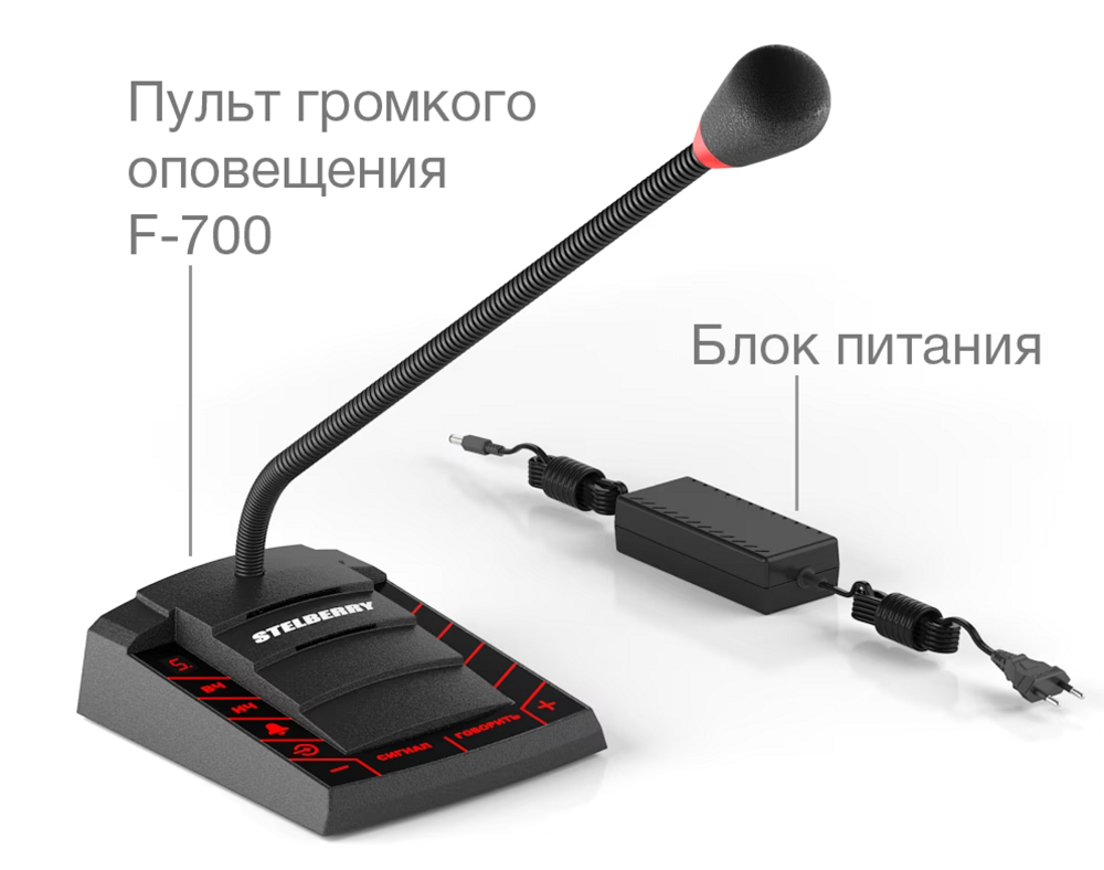 Цифровой микрофонный пульт модели F-700 создана для организации системы музыкально-речевых трансляций STELBERRY серии F в одной контрольной локации. Устройство позволяет транслировать голосовые объявления, сигнал для внимания («Гонг») и музыку или рекламные ролики от внешнего аудиооборудования. Такая система идеально подойдёт для малых офисных и административных пространств, автозаправочных станций, кафе, баров и ресторанных зон.
