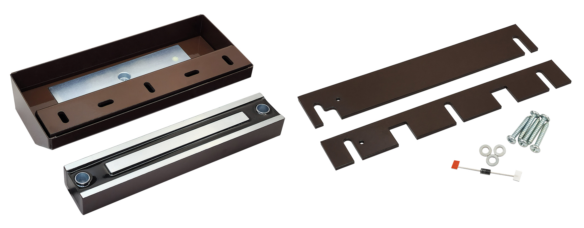 Конструктивно электромагнитный замок состоит из двух частей – корпусной и якорной. Габаритные размеры: корпус 225х42,5х27 мм, якоря 235х103х52 мм, масса замка 4.3 кг. Климатическое исполнение О1 согласно ГОСТ 15150-69, степень защиты от влаги и пыли IP67, рабочие температуры от -60°С до +50°С. Допускается эксплуатация в самых суровых условиях. Установка в любых помещениях, а также на улице. Универсальное питание - DC 12В или 24В. Подключение к контроллеру с помощью присоединенного четырехжильного кабеля длиной 0.5 метра. Коричневый цвет.