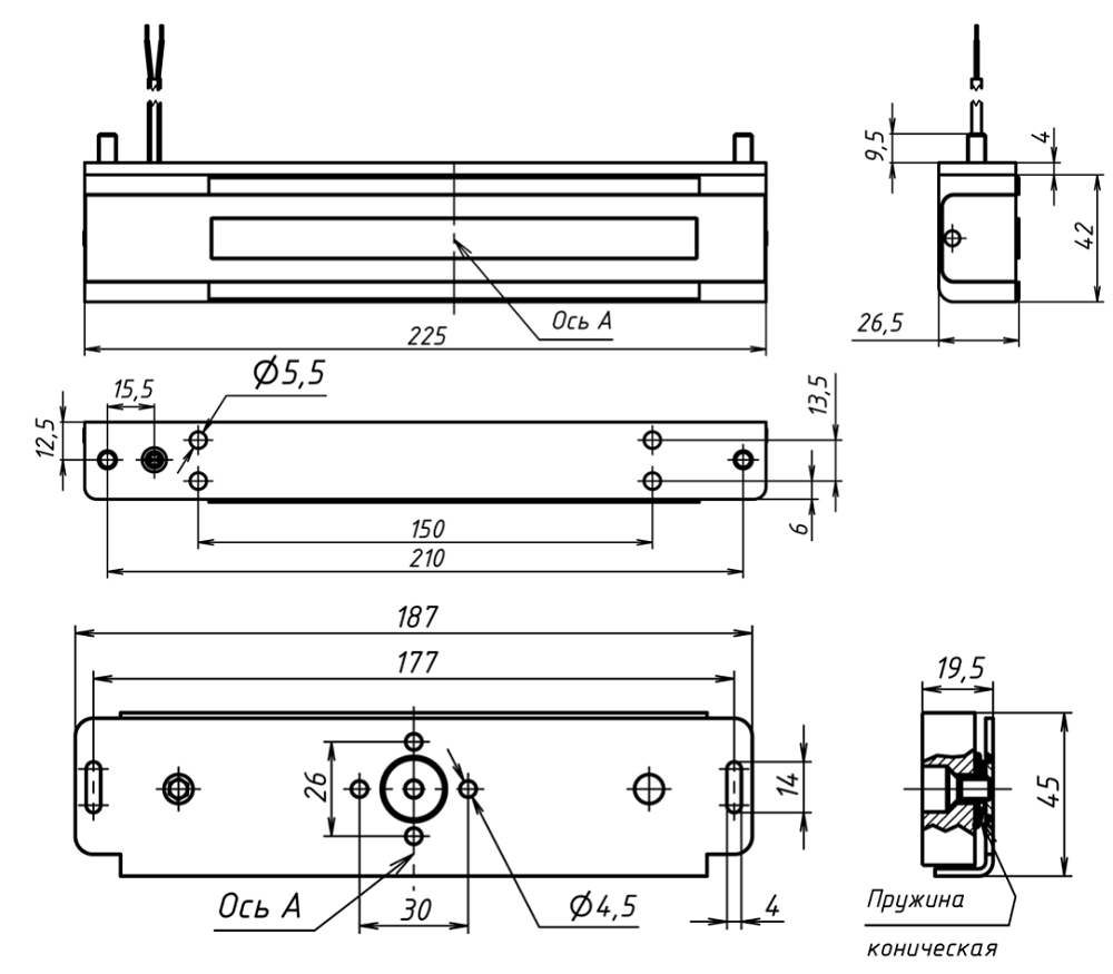 Монтаж накладной. Корпус монтируется на дверную коробку напротив якоря, установленного на полотне. Важным условием для обеспечения максимального удерживающего усилия и длительного срока службы с заданными эксплуатационными характеристиками без проведения техобслуживания является обязательное соблюдение плотного прилегания рабочих плоскостей обеих частей при закрытом положении двери.