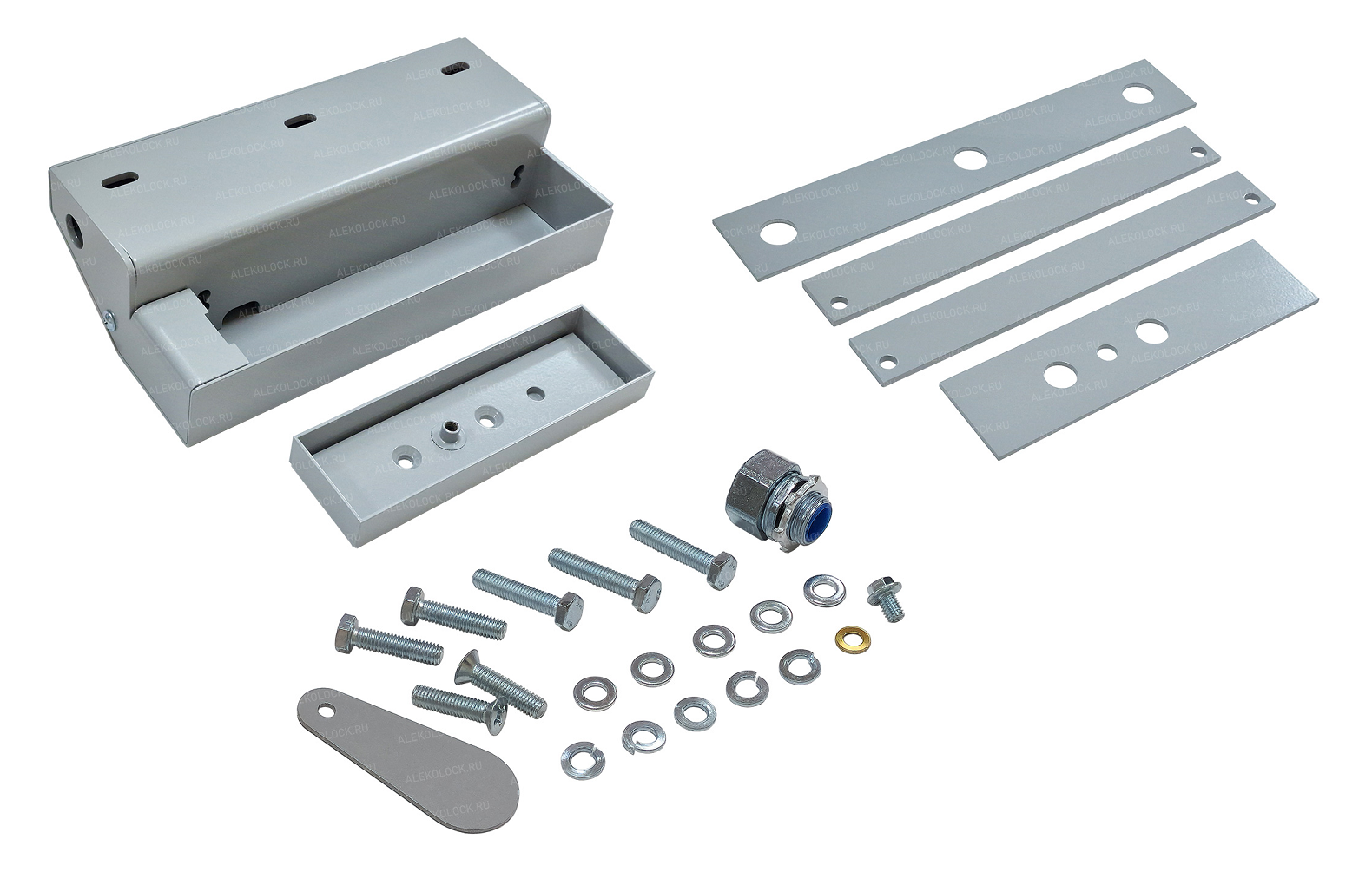 В составе комплекта: кожух, кронштейн, якорная часть, пластина кронштейна, две пластины корпуса, пластина якоря, муфта РКн-10, заглушка и комплект крепежа. Кабельный ввод для последующей прокладки кабеля в металлорукаве МРПИ-10. Цвет серый.
