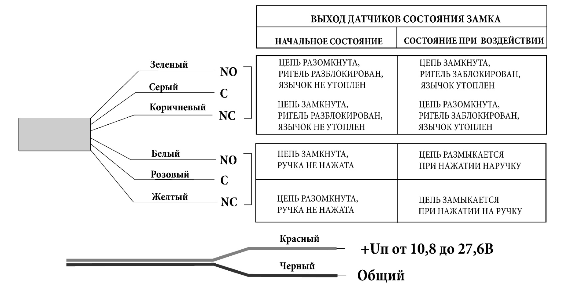 Предусмотрено 2 режима работы: нормально-открытый и нормально-закрытый; выбор при установке. В первом варианте, без питания замка дверь (и внешняя ручка) находится в свободном состоянии, но при поступлении напряжения от управляющего прибора, замок блокирует дверь и внешнюю ручку. В случае выбора режима НЗ, без питания замок закрыт, внешняя ручка заблокирована, а при подаче напряжения дверь разблокируется и внешняя ручка переводится в рабочее состояние. Как указывалось выше, внутренняя ручка в активна в любом из вариантов использования замка.