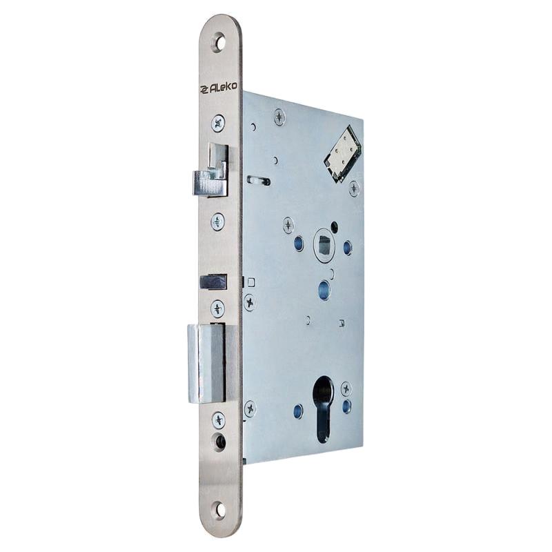 Эксплуатируется с дверьми открывающимися как справа, так и слева. При закрытии (захлопывании) двери автоматически срабатывают 2 ригеля: плоский с выходом 20 мм и двойной на 10 мм, и замок фиксируется в закрытом положении. Цилиндр монтируется обязательно, замок всегда можно открыть ключом поставляемым в комплекте. Расстояние между наружной торцевой плоскостью планки замка и серединой цилиндра (бэксет) составляет 65 мм.