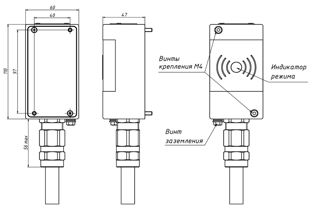 Габаритные размеры 110х60х47 мм, вес 1.3 кг. Питание от источника постоянного тока DC 12В. Подключение производится посредством присоединенного кабеля длиной 1 метр и герметичного кабельного ввода. Тип кабельного ввода определяются при заказе. К выбору доступны следующие варианты кабельных вводов - для открытой прокладки, для прокладки в металлорукаве МРПИ-15, для прокладки в трубе G 1/2" или для прокладки бронированного кабеля. Обращаем ваше внимание, что в случае выбора ввода для бронированного кабеля цена будет выше, чем указано в этой карточке.