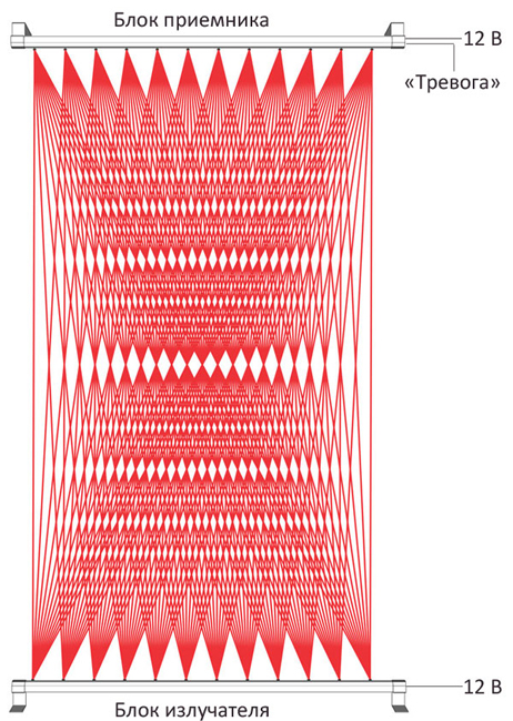 Блоки извещателя монтируются рабочей стороной друг к другу, сверху и снизу от охраняемого объекта и на расстоянии от него не менее чем 200 мм (излучатель располагается снизу). Между блоками может быть дистанция от 2-х до 6-и метров, которая и будет высотой обнаружения; протяженность зоны обнаружения = 1060 мм. Если нужно организовать большую ширину, то требуется использовать более одного комплекта извещателей.