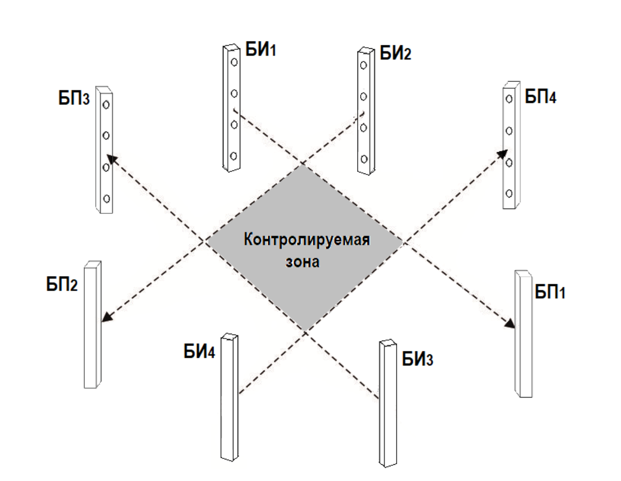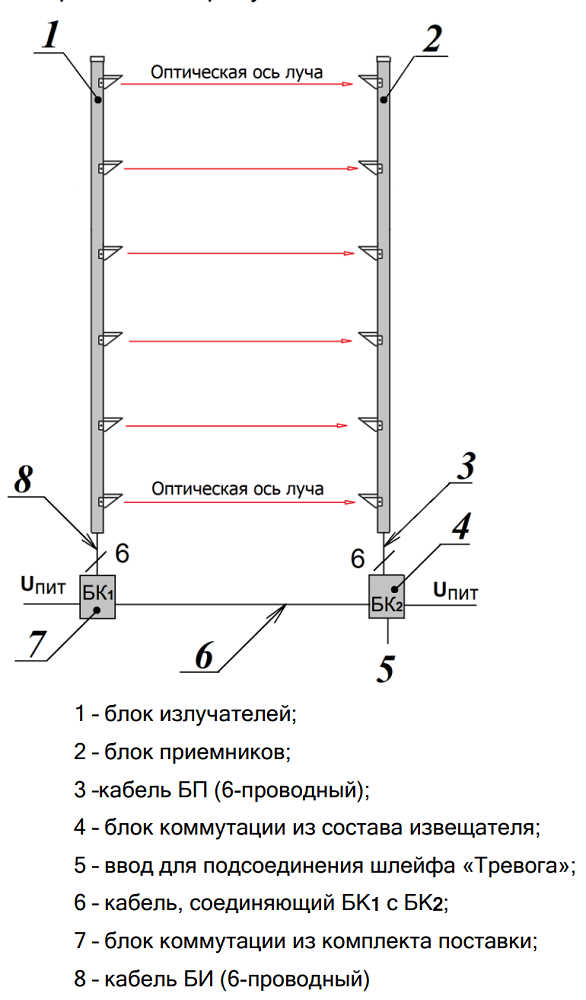Блоки извещателя (стойки БИ и БП) должны располагаться рабочей стороной друг к другу и находиться на расстоянии от двух до пятидесяти метров. Извещатели серии ИВА позволяют создавать охранные зоны различных конфигураций, в том числе и защищать периметр на дальности больше 50 метров. Для этого необходимо использовать несколько комплектов, а также следовать правилу, что количество БК в системе должно быть равно количество извещателей + 1.