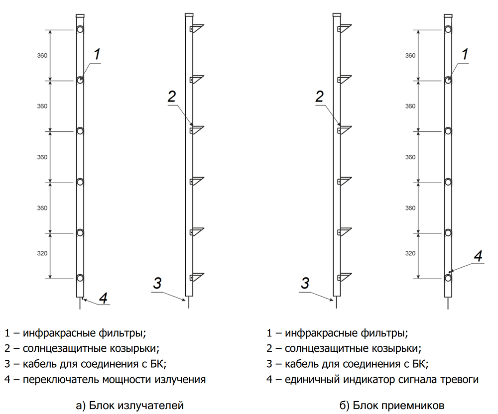 Охранный линейный оптико-электронный извещатель ИВА-4.1 состоит из трех блоков: стойка с четырьмя излучателями (БИ), стойка с четырьмя приемниками (БП) и блок коммутации (БК). Передатчики и приемники формируют между собой инфракрасный барьер протяжённостью от 2 до 50 метров. Прибор предназначен для эффективного выявления несанкционированных вторжений на различные территории, в том числе, контроль за проходами в ограждениях (ворота, калитки, въезды/выезды и т.п.), а также фиксация переброса предметов поверх ограждения. Широко применяется в современных охранных системах и системах контроля доступа.