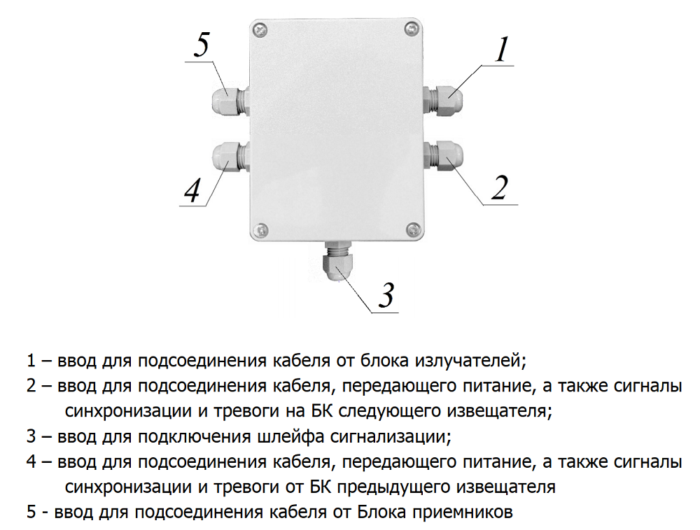 БК выполняет две функции. Отвечает за передачу сигнала синхронизации от БИ к БП, с целью получения отклика от нужного БП, что особенно актуально при работе нескольких комплектов извещателей недалеко друг от друга. Питание БИ и БП DC 10-30В организовано через БК. Корпус блока герметичен и оснащен несколькими кабельными вводами, которые покрывают все возникающие задачи. Встроенный датчик целостности корпуса БК, формирует тревожное извещение того же типа, что и основное. Помимо отправки сигнала тревоги на контрольный блок, извещатель в каждом тревожном случае также сигнализирует на месте с помощью звукового сигнала.