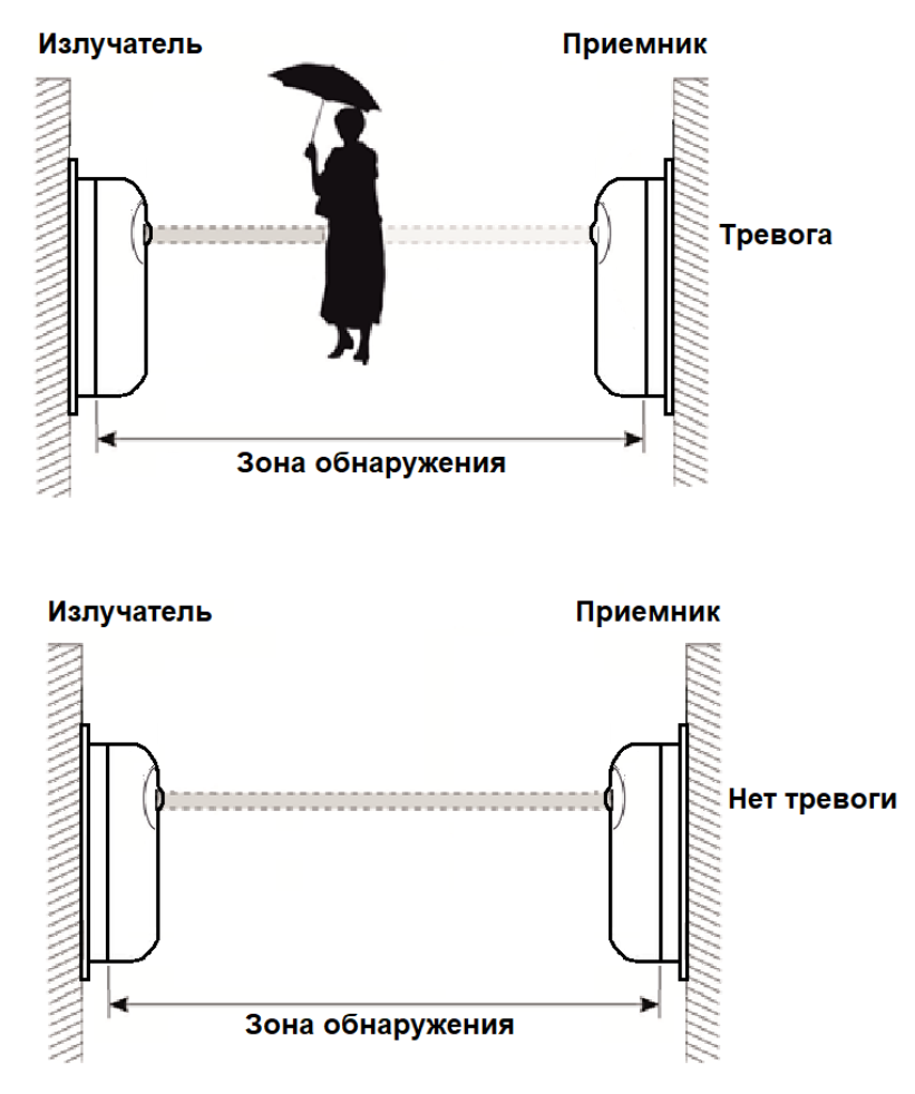 Работа прибора основана на формировании одного светового потока, длина волны луча лежит в инфракрасном диапазоне с максимумом в 940 нм. Принцип формирования сигнала тревоги: если нарушитель перекрывает линию излучения, то на контрольный блок передается тревожное извещение. Сигнал тревоги формируется путём замыкания/размыкания нормально-разомкнутого или нормально-замкнутого реле (настраивается пользователем) с параметрами нагрузки 36 В / 1 А. Дальность действия составляет от 3-х до 20-и метров, максимальное расстояние может снижаться на 30% из-за атмосферных явлений (осадки, туман, запыленность и т.д.).