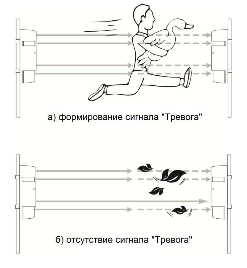 Работа прибора основана на формировании четырех параллельных световых потоков. Длина волны лучей лежит в инфракрасном диапазоне с максимумом в 940 нм. Принцип формирования сигнала тревоги: если нарушитель одновременно перекрывает все четыре линии излучения, то по истечении заранее заданного времени (50 - 700 мс) на контрольный блок передается тревожное извещение. Сигнал тревоги формируется путём замыкания «сухого контакта» с параметрами нагрузки 72 В / 30 мА. Встроенный датчик целостности корпуса с аналогичными типом тревожного извещения.