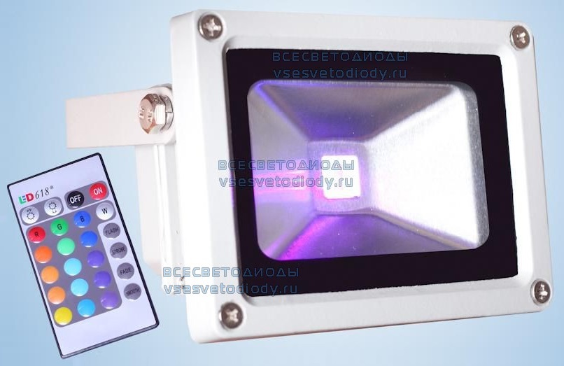 ВСЕСВЕТОДИОДЫ EPISTAR 10W 800Lm – уличный светодиодный RGB прожектор, оснащенный сверхмощным светодиодом на 10 Вт и 800 Лм от компании EPISTAR. Широкий угол рассеивания светового потока в сочетании с различными цветами свечения делают его наиболее удачным выбором для организации архитектурной подсветки фасадов зданий, фонтанов и памятников, ландшафтного освещения, подсветки рекламных щитов и т.д. Прожектор надежно защищен от проникновения внутрь пыли и влаги (IP65), не чувствителен к воздействию экстремально низких/высоких температур и не требует регулярного технического обслуживания, за счет чего может устанавливаться в любых, даже наиболее труднодоступных местах. Для удобства пользователя в комплект поставки включен пульт дистанционого управления и металлический кронштейн-скоба, позволяющий изменять направление светового потока в вертикальной или горизонтальной плоскости.