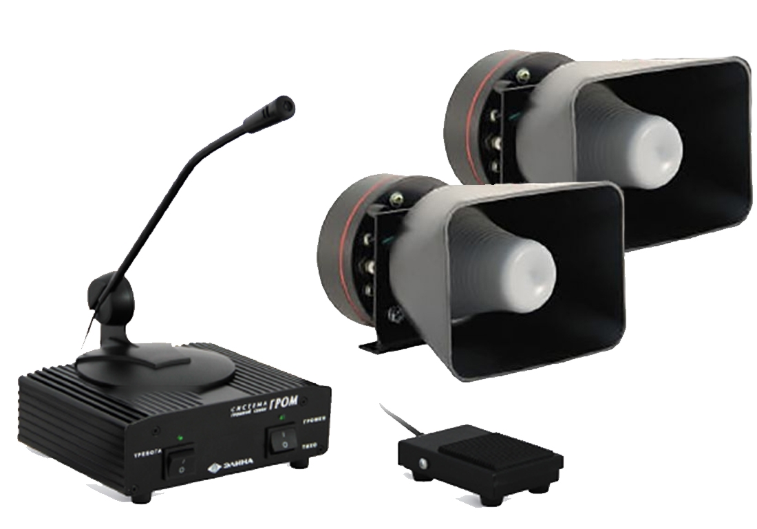 | Состав системы | Блок управления, микрофон оператора («гусиная шея»), педаль активации, 2 рупорных громкоговорителя |