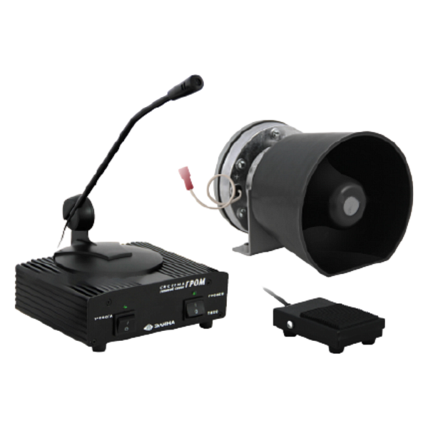 | Состав системы | Блок управления, микрофон оператора («гусиная шея»), педаль активации, 1 рупорный громкоговоритель |