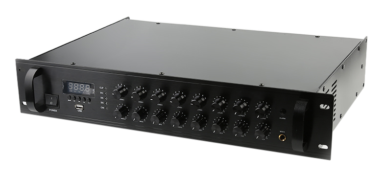 Одноканальный, выходная мощность = 240 Вт. Усилитель можно использовать с низкоомными (импеданс 4-16 Ом) или с трансляционными (напряжение 70/100В) акустическими системами. Зональное вещание доступно только с громкоговорителями 70/100В.