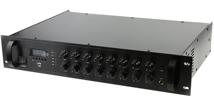 Одноканальный, выходная мощность = 360 Вт. Усилитель можно использовать с низкоомными (импеданс 4-16 Ом) или с трансляционными (напряжение 70/100В) акустическими системами. Зональное вещание доступно только с громкоговорителями 70/100В.
