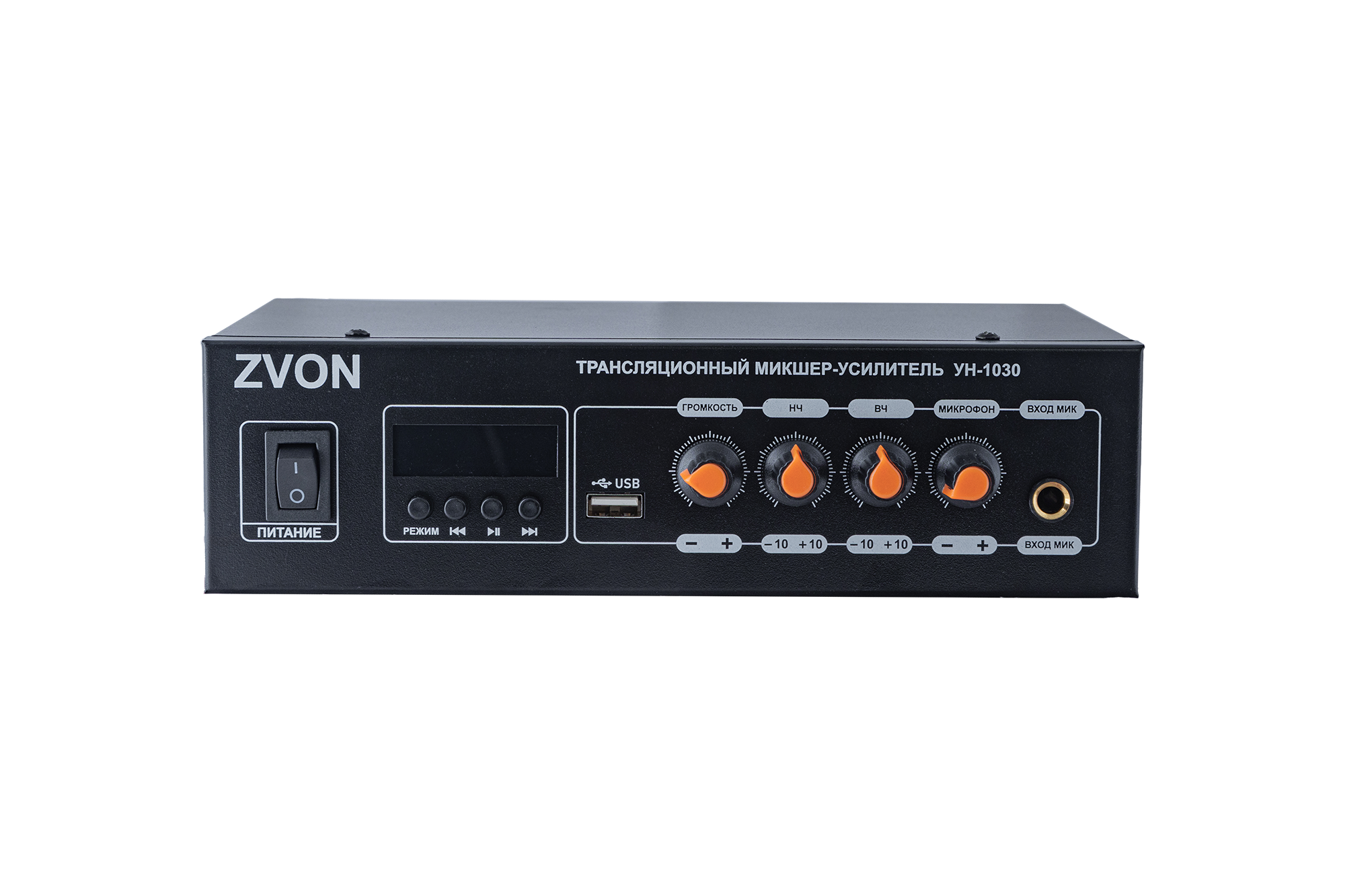 Микшер-усилитель УН-1030 из серии ZVON от MKV Pro подходит для создания на его базе небольших аудиосистем, выполняющих функции музыкально-речевых трансляций и голосовых объявлений. Встроенный медиаплеер позволяет применять усилитель автономно, используя в качестве источника звука USB-носитель. Целесообразна эксплуатация на таких объектах как АЗС, магазины, кафе, рестораны, лобби гостиниц, залы ожидания и т.д.