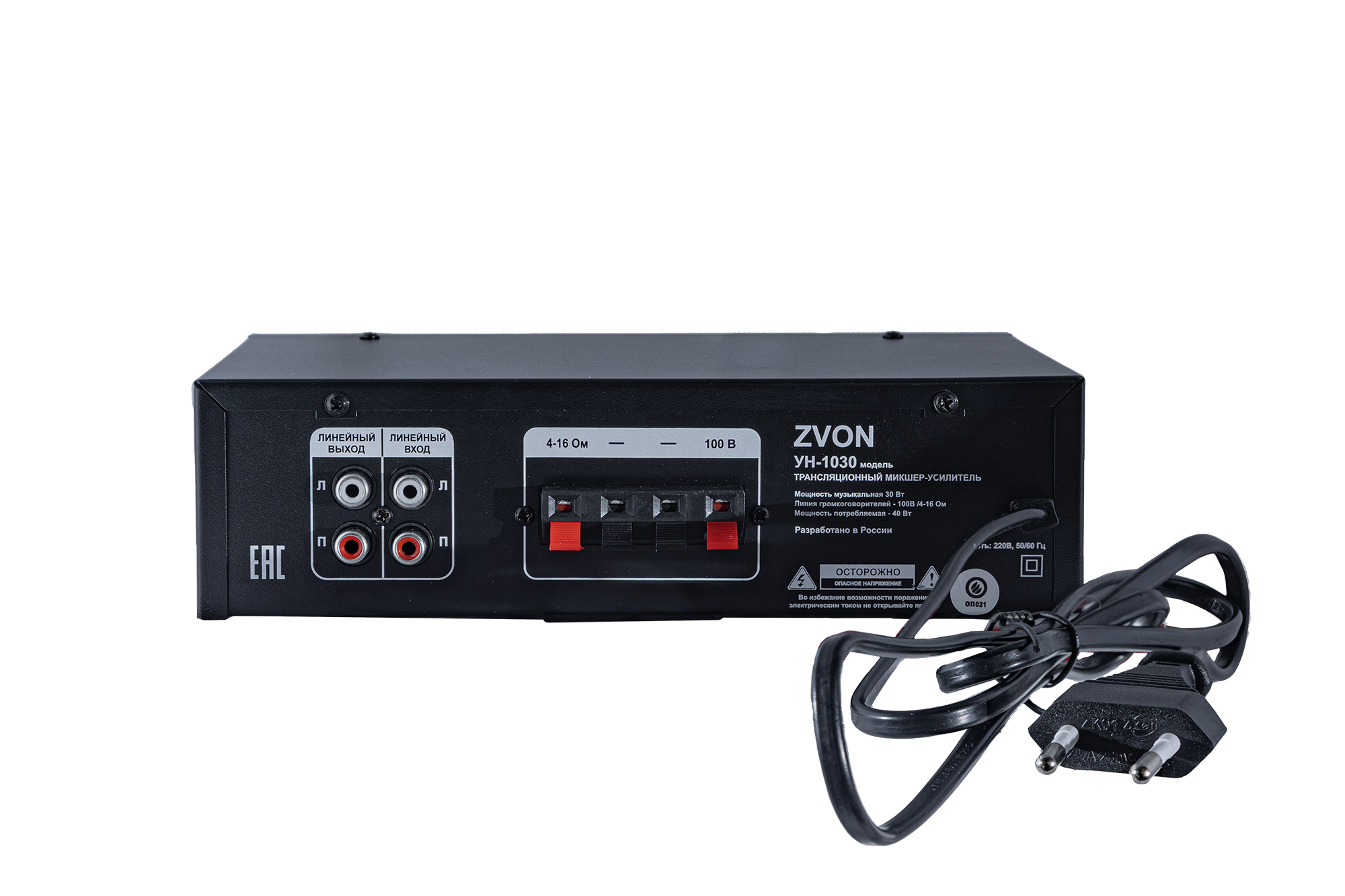 Одноканальный, выходная мощность = 30 Вт. Усилитель можно использовать с низкоомными акустическими системами (импеданс 4 - 16 Ом) или с трансляционными (напряжение линии 100В). ВНИМАНИЕ! Одновременно подключаются только АС одного типа!