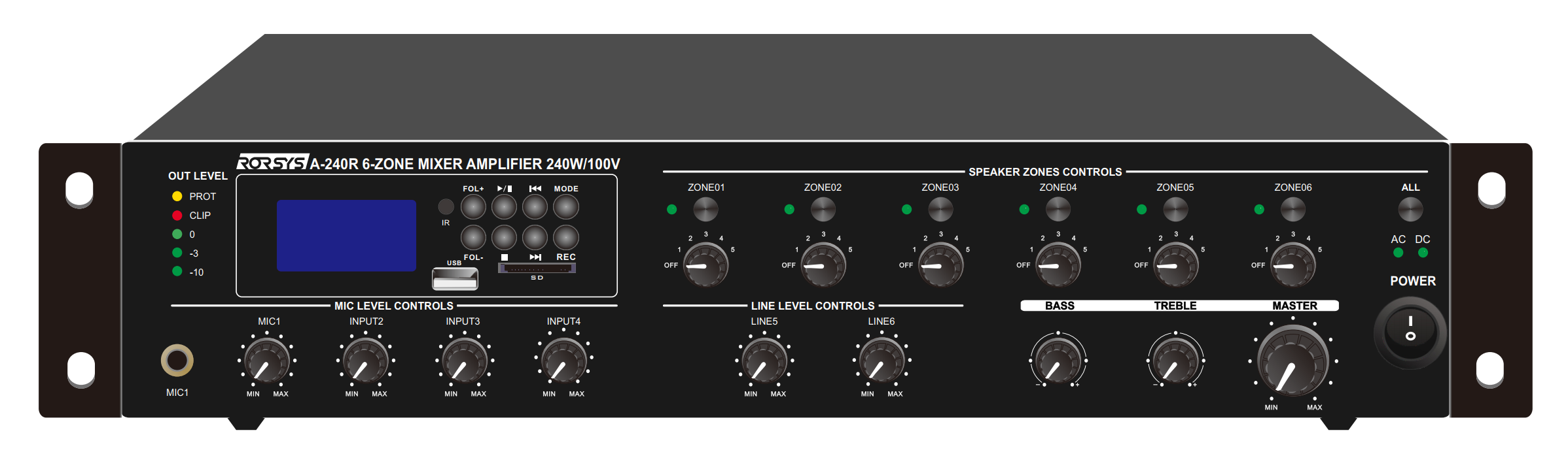 Зональный микшер-усилитель A-240R подходит для создания на его базе профессиональных аудио-систем, выполняющих функции фонового музыкального вещания или голосовых объявлений в шести (6) независимых зонах. Встроенный медиаплеер дает возможность применять усилитель автономно, без подключения внешних источников звука. Целесообразна эксплуатация на таких объектах, как магазины и бутики, АЗС, кафе, рестораны, офисы, банки, лобби отелей, залы ожидания и т.д.