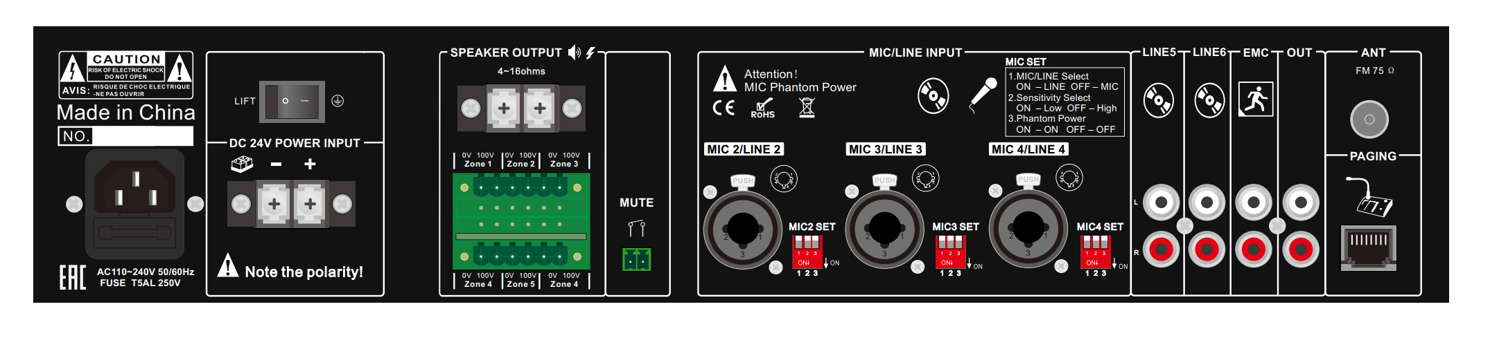 Аудиовыходы: линейный, 2RCA, для подключения приемника или внешнего рекордера; клеммный блок для низкоомной акустики с импедансом 4-16 Ом + шесть, по количеству поддерживаемых зон, разъемов Euroblock для трансляционных громкоговорителей с напряжением 100В. Предусмотрено дистанционное управление посредством микрофонной консоли с селектором зон, подключение через разъем RJ-45. Все коннекторы, кроме микрофонного, размещены на тыльной части корпуса.