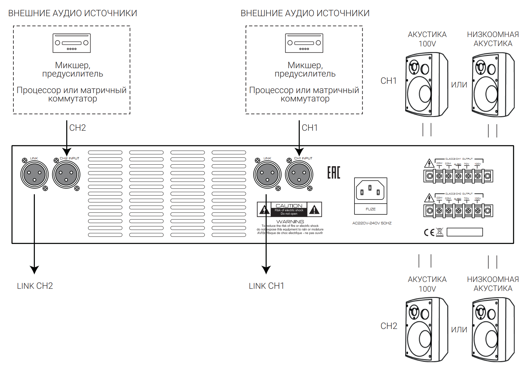 Для каждого усилительного канала есть отдельный линейный аудиовход (2х XLR) и аудиовыход на акустику (2 блока винтовых клемм). Два линейных выхода типа Link (разъемы 2х XLR) используются с целью синхронизации вещания в обоих каналах от одного источника звука. Независимая поканальная регулировка громкости. Коннекторы на тыльной части корпуса, на лицевой панели регуляторы громкости, светодиодная индикация для каждого из 2-х каналов и кнопка питания.