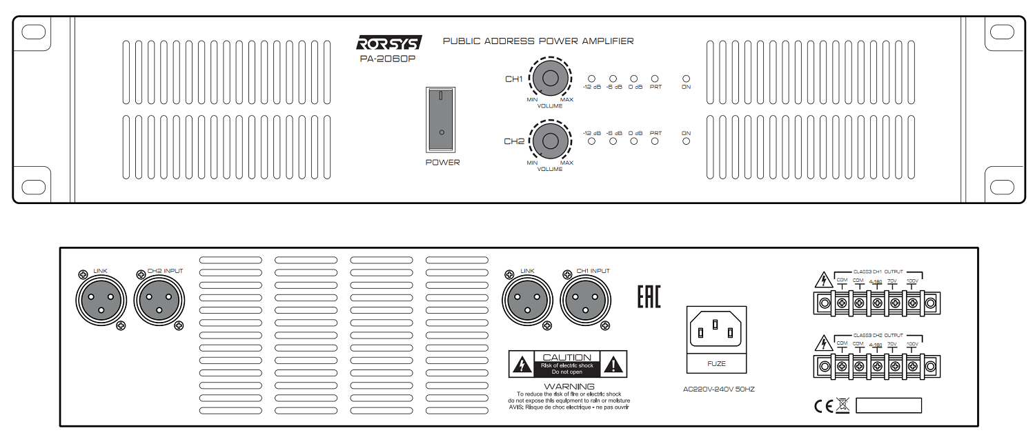 Для каждого усилительного канала есть отдельный линейный аудиовход (2х XLR) и аудиовыход на акустику (2 блока винтовых клемм). Два линейных выхода типа Link (разъемы 2х XLR) используются с целью синхронизации вещания в обоих каналах от одного источника звука. Независимая поканальная регулировка громкости. Коннекторы на тыльной части корпуса, на лицевой панели регуляторы громкости, светодиодная индикация для каждого из 2-х каналов и кнопка питания.