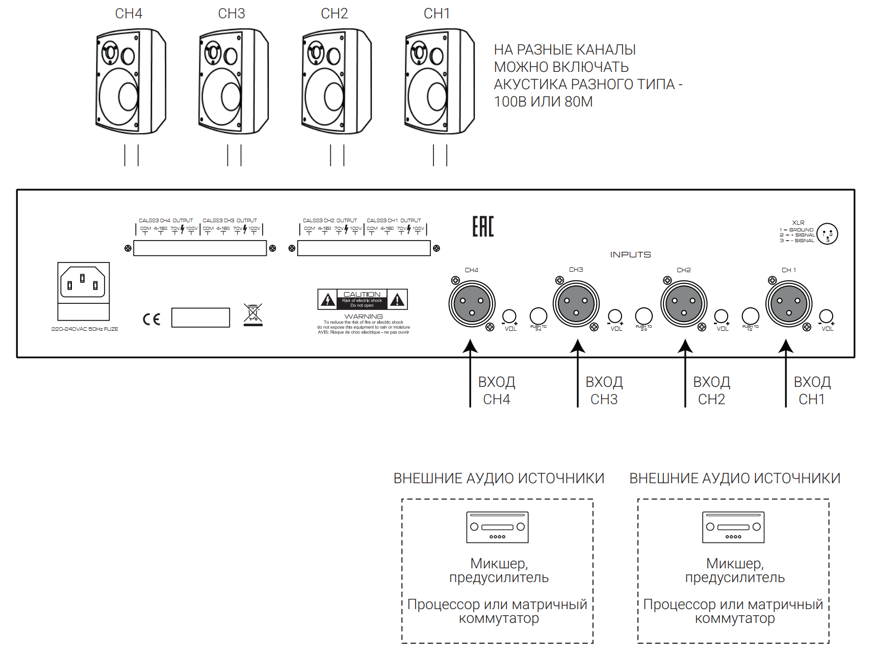Для каждого усилительного канала есть отдельный линейный аудиовход (4х XLR) и аудиовыход на акустику (4 блока винтовых клемм). Независимая поканальная регулировка громкости. У входов с номерами 1, 2 и 3 предусмотрены кнопки Push to, которые при подключении выполняют функцию внутренней беспроводной линковки, чтобы сигнал подаваемый на активированный вход транслировался и в другом канале (с первого на второй, со второго на третий и с третьего на четвертый). Коннекторы и управление на тыльной части корпуса, на лицевой панели только светодиодная индикация для каждого из 4-х каналов и кнопка питания.