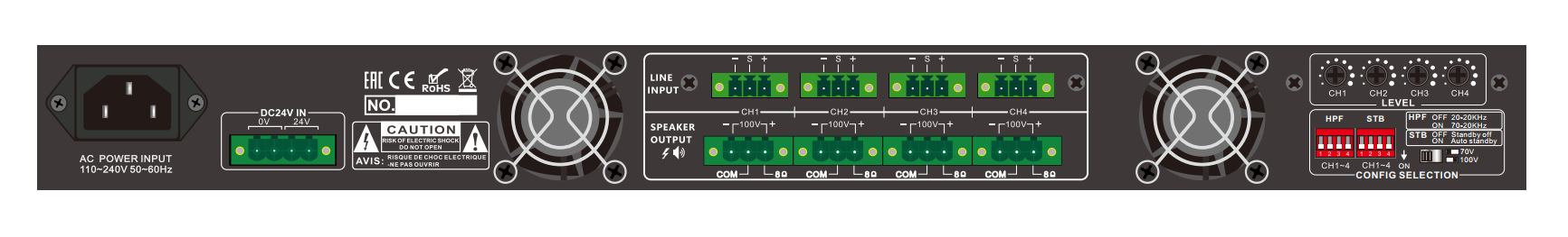 Четырехканальный (4 канала), выходная мощность = 4х 240 Вт. Усилитель можно использовать с низкоомными акустическими системами (импеданс 8 Ом) или с трансляционными (напряжение линии 70 или 100 В). Обеспечивает рабочие частоты в диапазоне 20 - 20 000 Гц, частота кроссовера 1 кГц. Для каждого усилительного канала предусмотрен отдельный линейный аудиовход и аудиовыход, все коннекторы на разъемах Euroblock 3-pin. Каждому каналу предусмотрена независимая регулировка уровня усиления (4 верньера). За настройки отвечает блок DIP-переключателей: выбор общего рабочего уровня напряжения на выходах между 70 и 100В; поканальная активация или дезактивация фильтра высоких частот (когда включен диапазон 70 - 20 000 Гц); поканальное подключение функции STB для автоматического перехода в режим ожидания, если в канале отсутствует акустический сигнал.