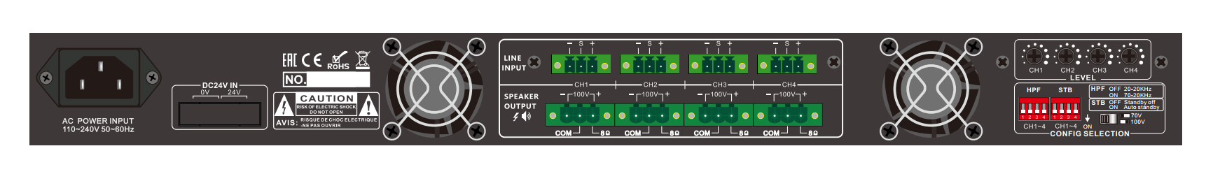 | Настройки | Общий переключатель 70/100В; поканальные ФВЧ, функция STB и регулировка усиления |