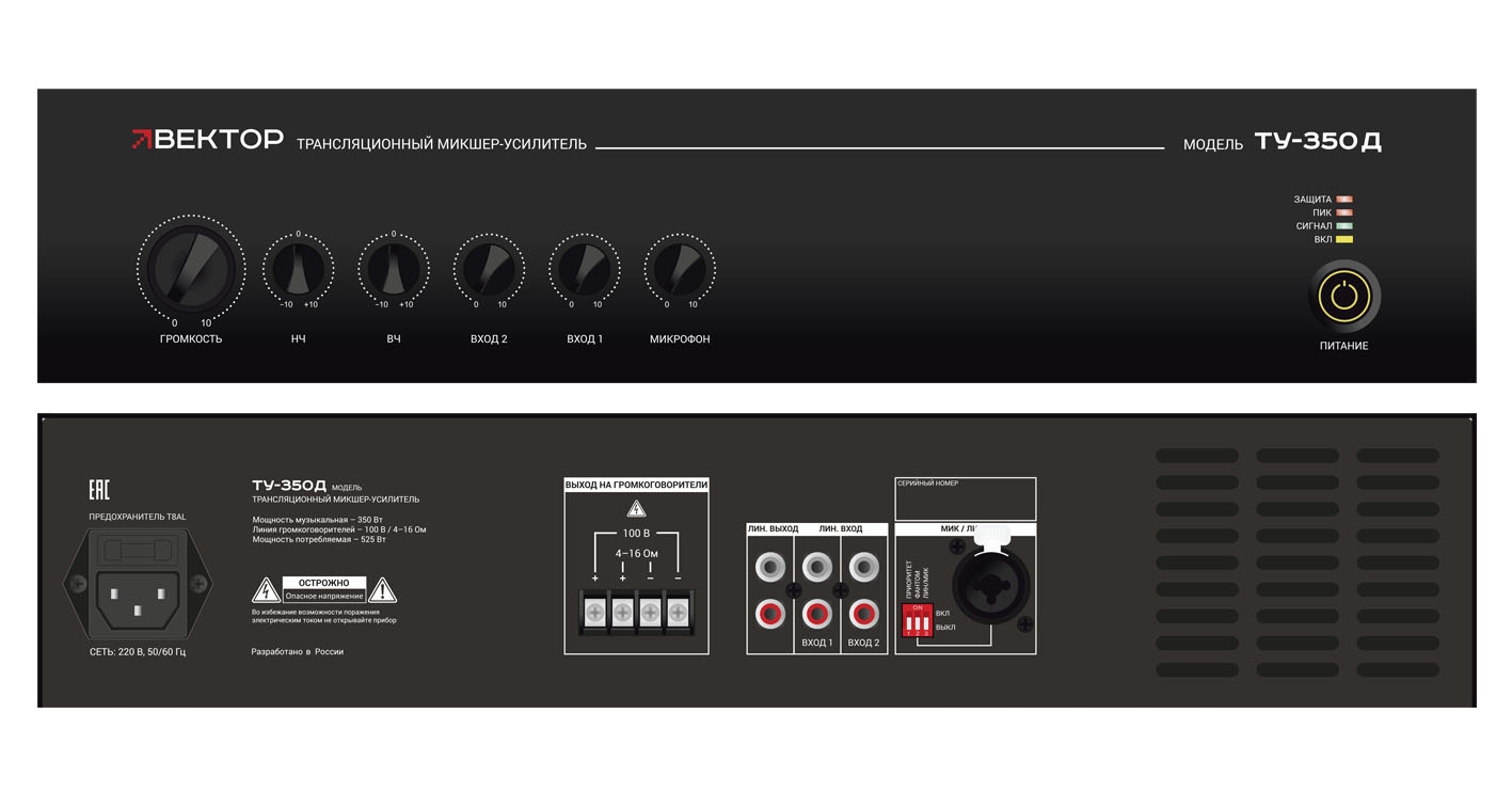 ВЕКТОР ТУ-350Д оборудован встроенным блоком питания с поддержкой широкого диапазона входного напряжения 110-220 В, 50/60 Гц; сниженная потребляемая мощность 525 Вт. Из дополнительного функционала стоит выделить встроенную защиту от перегрузки и КЗ. Габаритные размеры 430х88х375 мм, вес 8.8 кг.