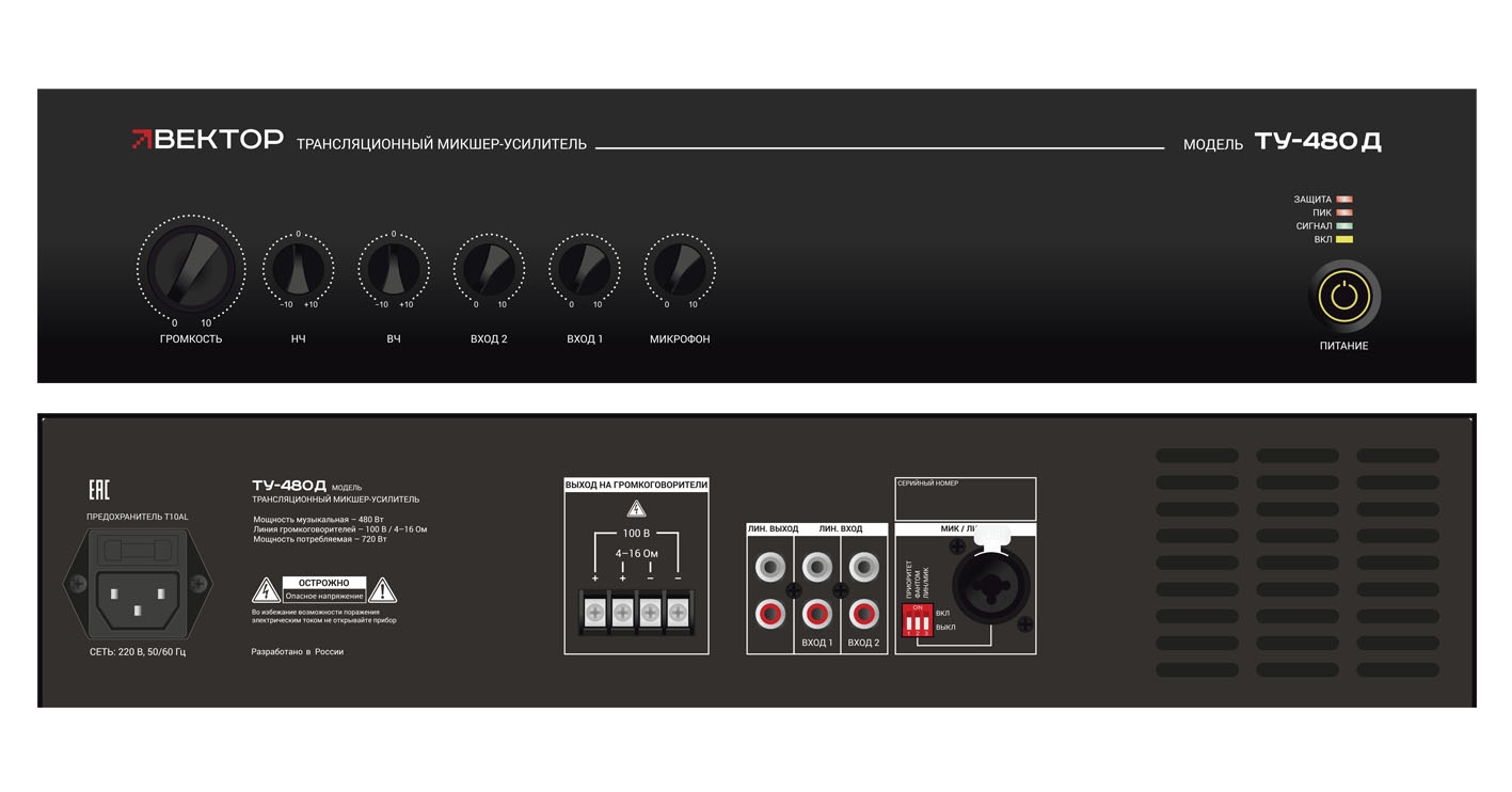 ВЕКТОР ТУ-480Д оборудован встроенным блоком питания с поддержкой широкого диапазона входного напряжения 110-220 В, 50/60 Гц; сниженная потребляемая мощность 720 Вт. Из дополнительного функционала стоит выделить встроенную защиту от перегрузки и КЗ. Габаритные размеры 430х88х375 мм, вес 9.3 кг.