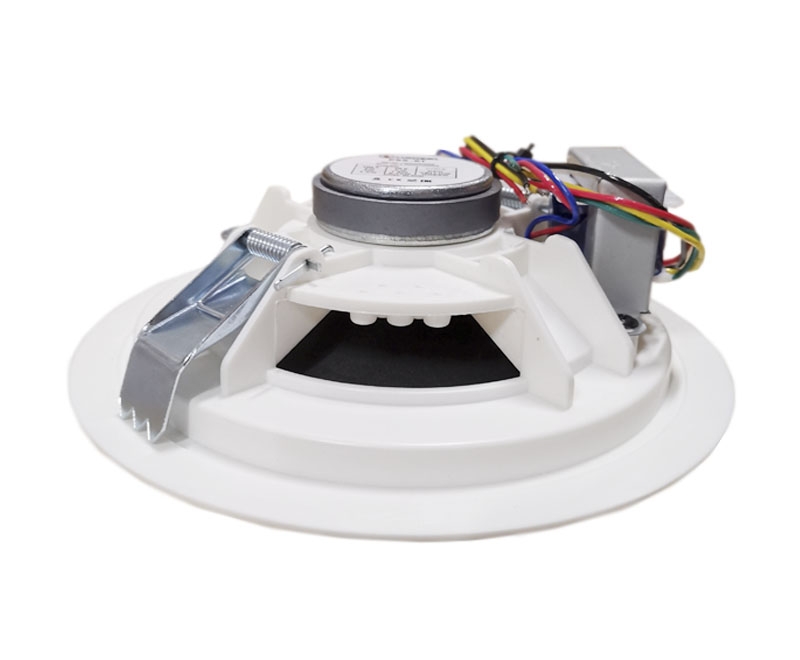Корпус CSS-6T изготовлен из пластика, динамик защищает металлическая сетка. Белый цвет. Габаритные размеры Ø 175 мм, глубина 60 мм, масса 500 г. Монтаж в помещениях, в потолок с помощью самозажимных пружинных креплений, диаметр монтажного отверстия 155 мм.