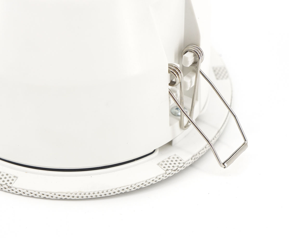 Материалом корпуса служит прочный пластик. Габаритные размеры Ø140х80 мм, масса 0.9 кг. Монтаж встраиваемый в потолок. IP66, рабочие температуры от -10°C до +90°C. Белый цвет.