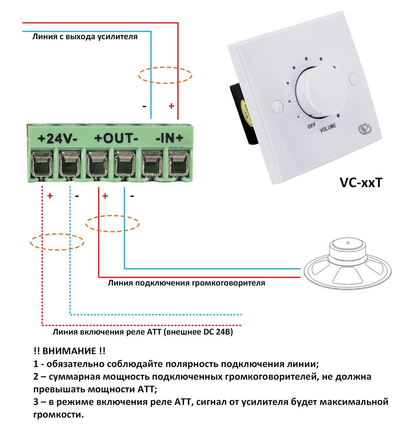 VOLTA VC-120R – 10-позиционный регулятор громкости (аттенюатор) со встроенным реле принудительного отключения аттенюации DC 24В, рассчитанный на подключение трансляционной акустики суммарной мощностью до 120 Вт.