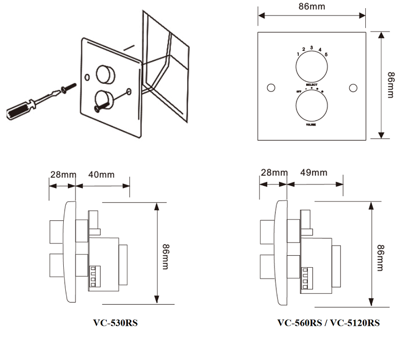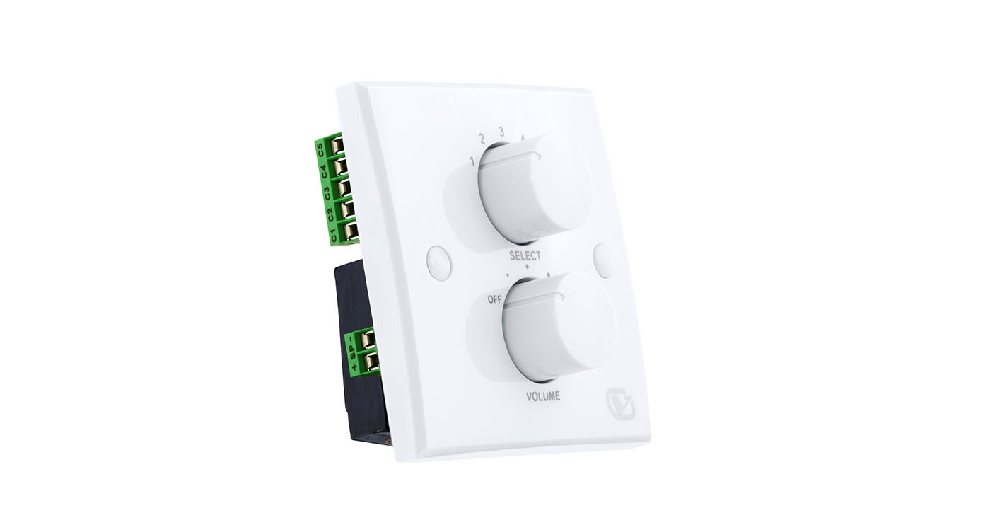 VOLTA VC-5120RS – 5-позиционный регулятор громкости (аттенюатор) с селектором для выбора программы вещания и встроенным реле принудительного отключения аттенюации DC 24В. Рассчитан на подключение трансляционной акустики суммарной мощностью до 120 Вт.