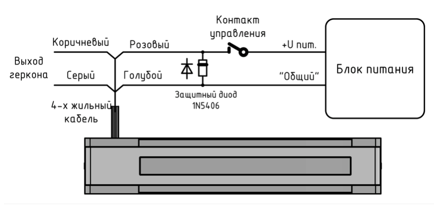 Нормально-открытое устройство. Без питания замка дверь находится в свободном состоянии, но при поступлении напряжения от управляющего прибора, замок блокирует дверь и остается закрытым пока питание в наличии. Встроенный датчик контроля положения двери (геркон) мониторит ее состояние (открыта или закрыта) и передает данные на контрольный блок, что удобно при создании системы подсчета проходов. Также, геркон выполняет функцию тревожного извещения при фиксации некорректной работы двери или самого замка.