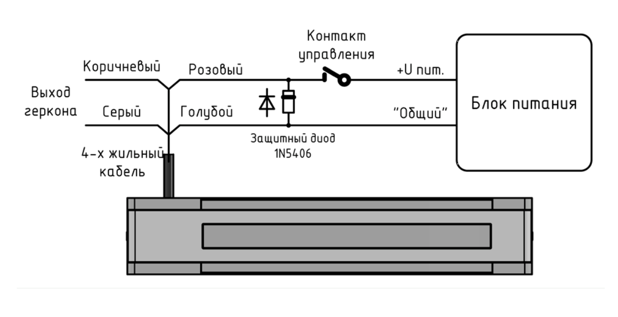 Нормально-открытое устройство. Без питания замка дверь находится в свободном состоянии, но при поступлении напряжения от управляющего прибора, замок блокирует дверь и остается закрытым пока питание в наличии. Встроенный датчик контроля положения двери (геркон) мониторит ее состояние (открыта или закрыта) и передает данные на контрольный блок, что удобно при создании системы подсчета проходов. Также, геркон выполняет функцию тревожного извещения при фиксации некорректной работы двери или самого замка.