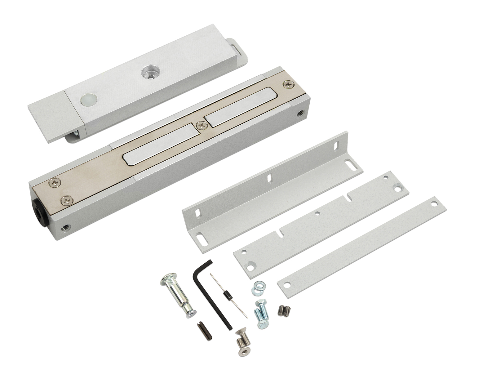 Монтаж накладной. Корпус монтируется в верхней части дверной коробки напротив якоря, установленного на полотне. Важным условием для обеспечения максимального удерживающего усилия и длительного срока службы с заданными эксплуатационными характеристиками без проведения техобслуживания является обязательное соблюдение плотного прилегания рабочих плоскостей обеих частей при закрытом положении двери.