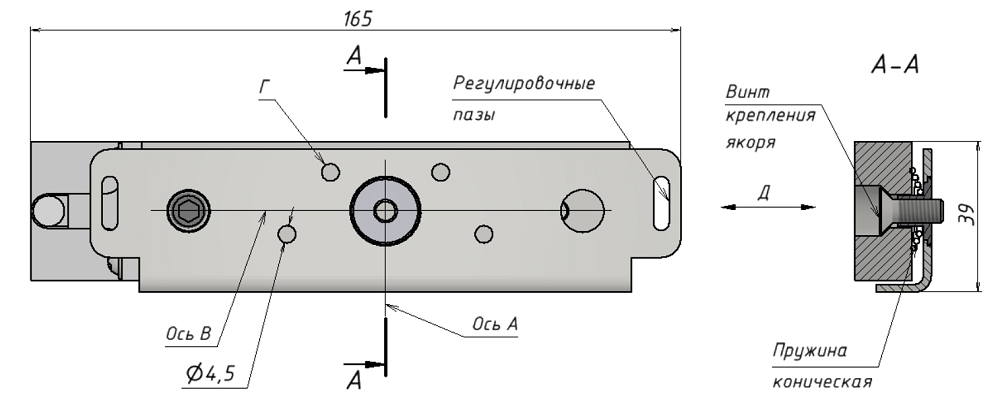 Монтаж накладной. Корпус монтируется в верхней части дверной коробки напротив якоря, установленного на полотне. Важным условием для обеспечения максимального удерживающего усилия и длительного срока службы с заданными эксплуатационными характеристиками без проведения техобслуживания является обязательное соблюдение плотного прилегания рабочих плоскостей обеих частей при закрытом положении двери.